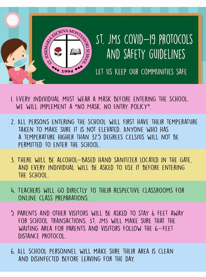 When St. JMS reopens in June for our teachers, staff, and families (for enrollment purposes), the following PROTOCOLS must be followed strictly before entering our premises.